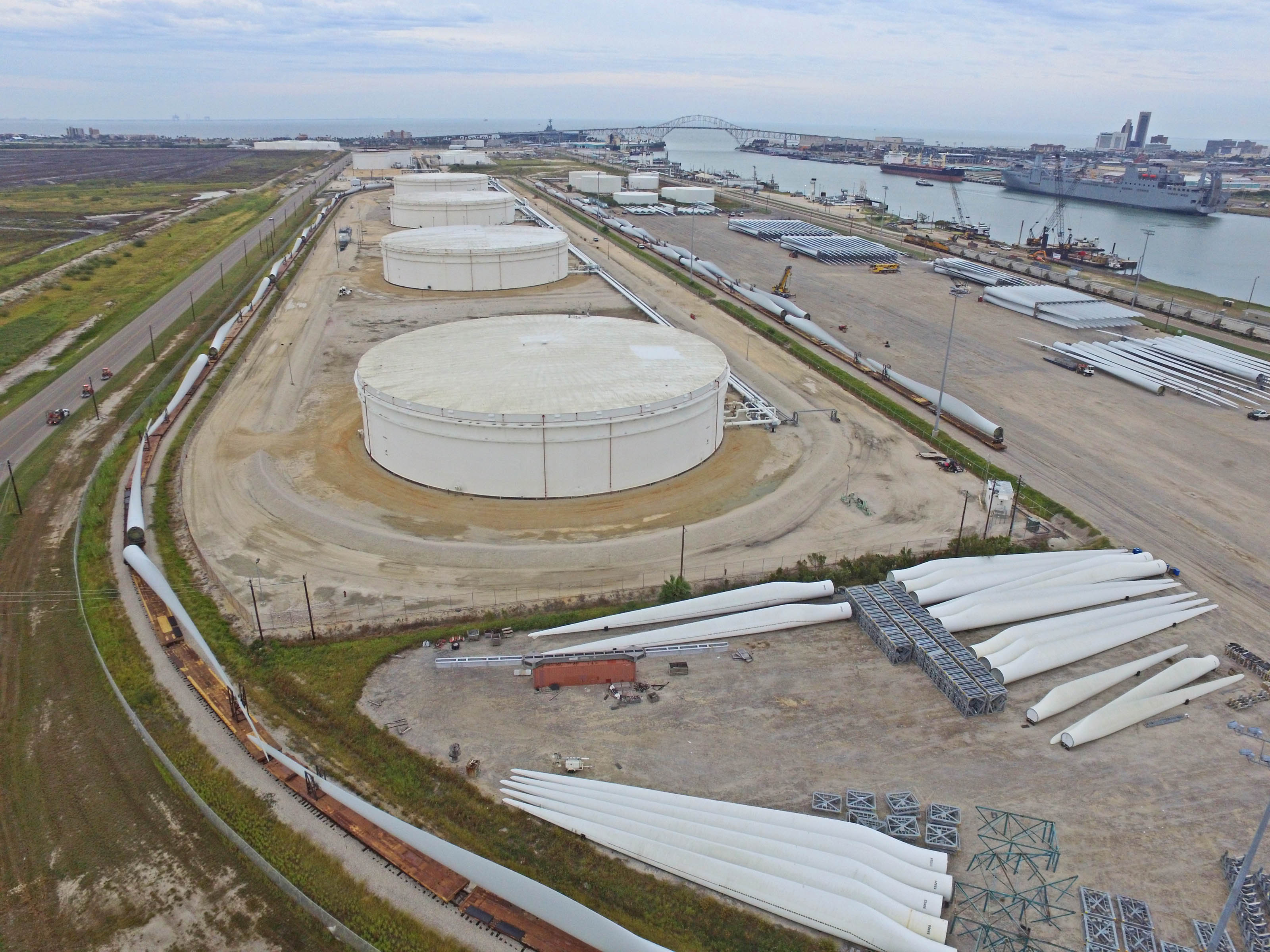 Componentes de energía eólica y tanques de almacenamiento de crudo/condensado en la dársena interior del puerto de Corpus Christi